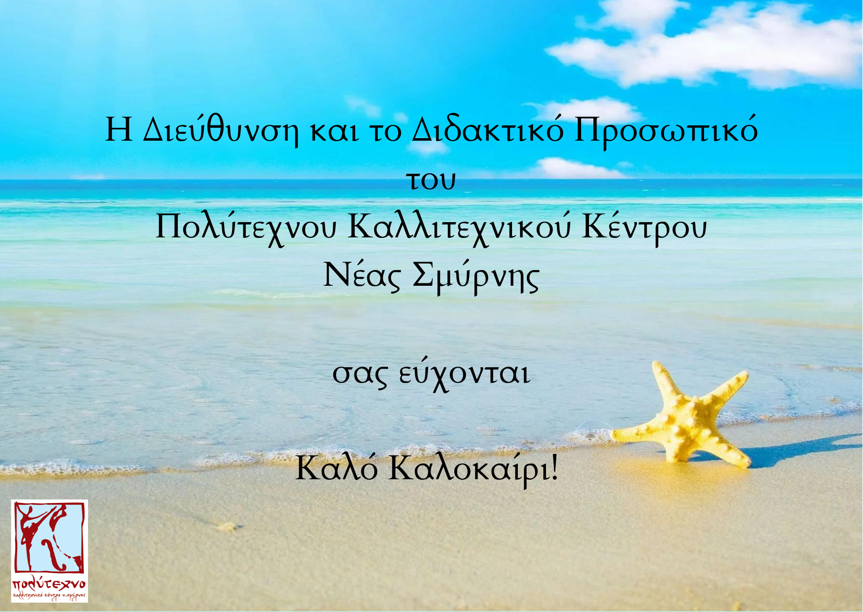 Η Διεύθυνση και το Διδακτικό Προσωπικό του Πολύτεχνου Καλλιτεχνικού Κέντρου Νέας Σμύρνης, σας εύχονται να έχετε ένα όμορφο και δημιουργικό καλοκαίρι.