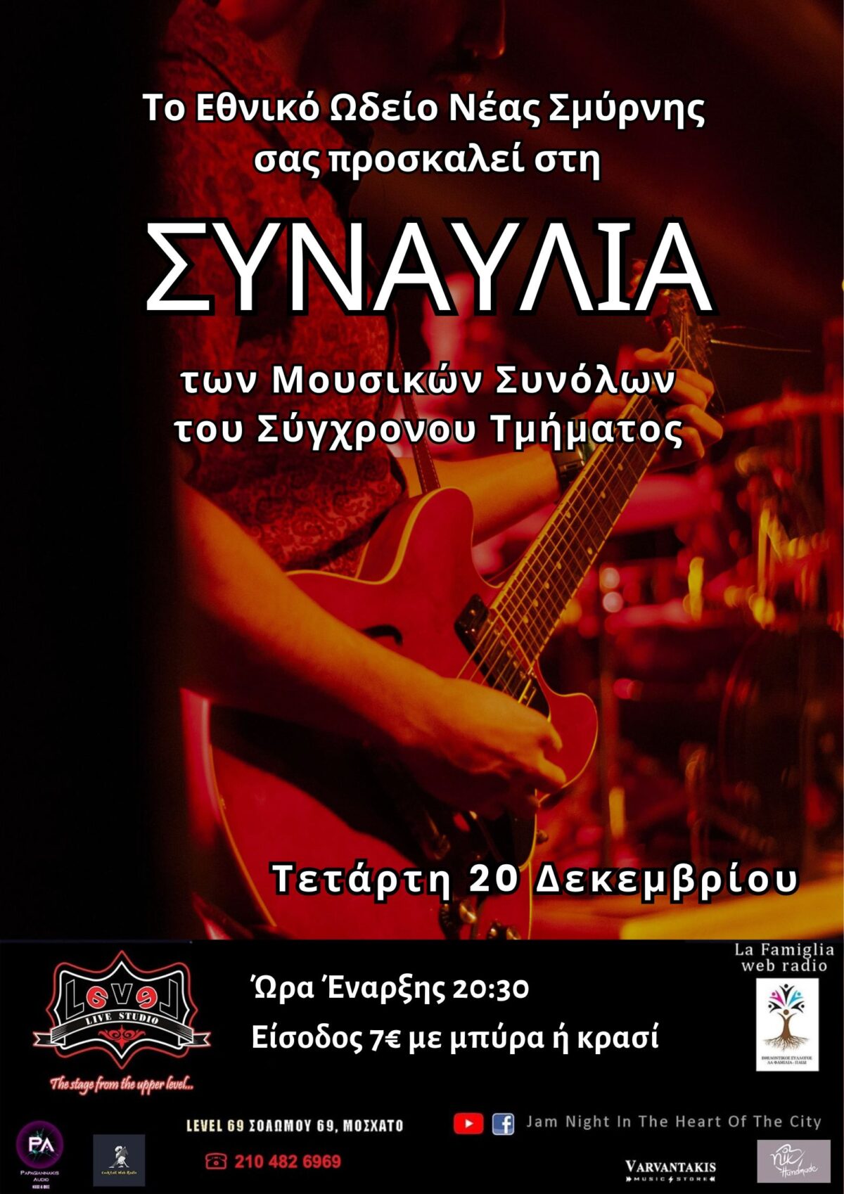 Το Εθνικό Ωδείο Νέας Σμύρνης σας προσκαλεί στη συναυλία των Μουσικών Συνόλων του Σύγχρονου Τμήματος την Τετάρτη 20 Δεκεμβρίου, η οποία θα πραγματοποιηθεί στο Level 69 (Σολωμού 69, Μοσχάτο).